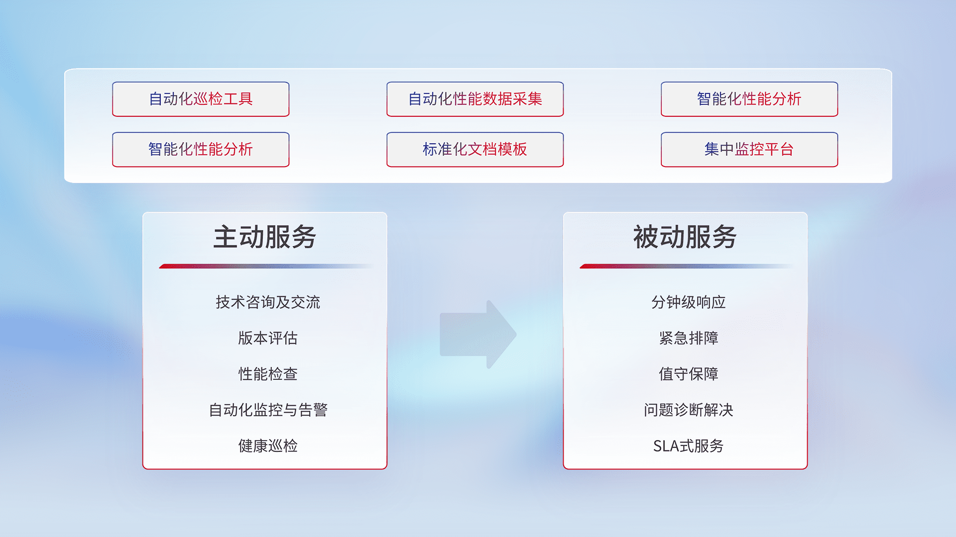 智能化工具和标准化文档,,保障服务质量,,,,提供主动服务(包含技术咨询、、、版本评估、、、性能检查、、自动化监控与告警、、、、健康巡检)和被动服务包含(分钟级响应、、紧急排障、、、、值守保障、、、、问题诊断解决、、、、SLA服务)。。。。