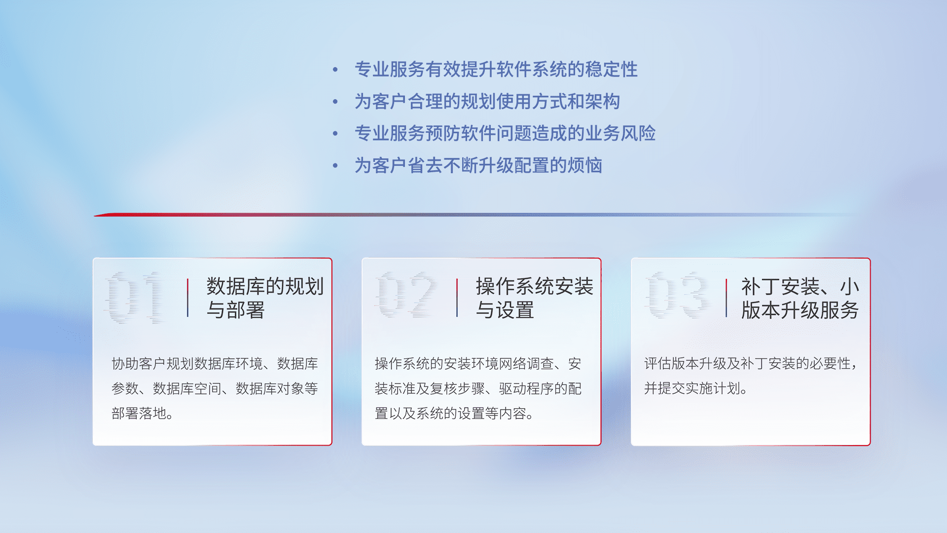 为客户提供软件规模升级、、、快速部署、、按需配置的专业服务,,从数据库的规划与部署到操作系统的安装与设置,,再到补丁安装和小版本升级提供支持。。