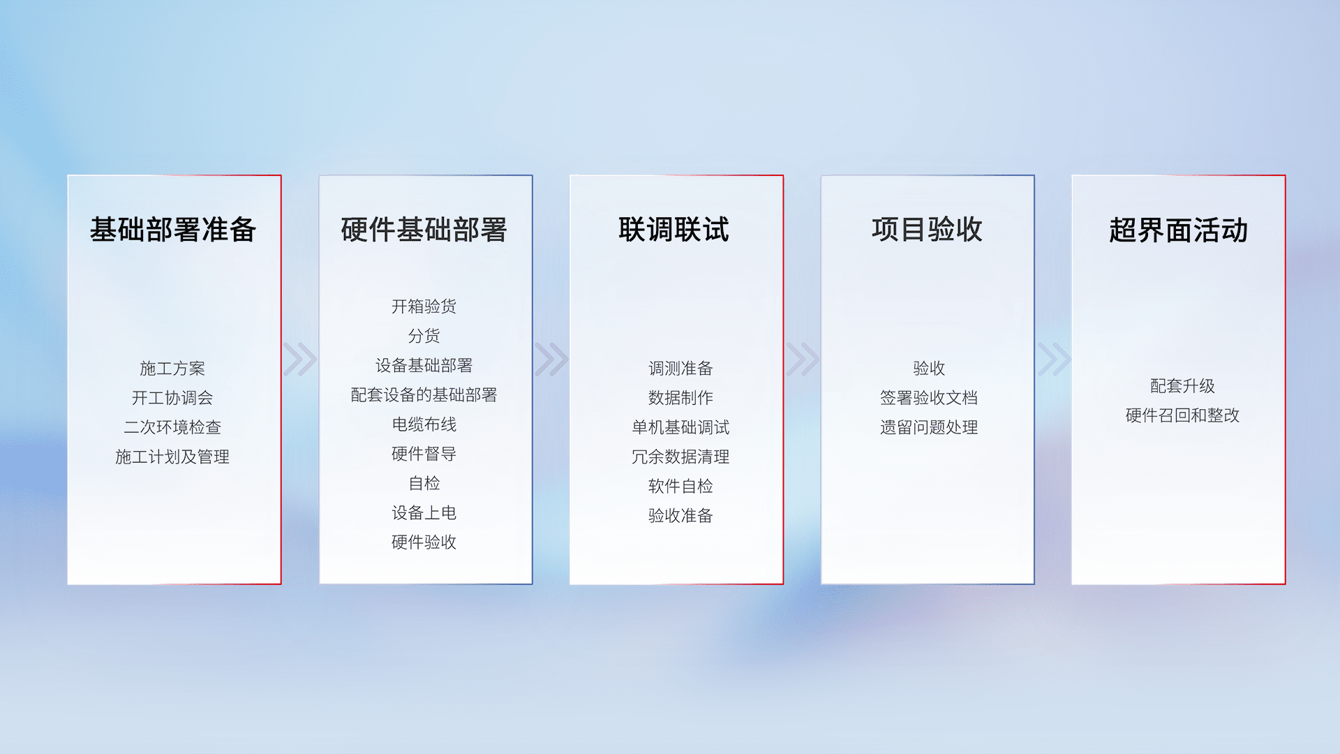 从基础部署准备、、、、硬件基础部署、、、、联调联试、、项目验收、、、、越界面活动的全过程可追溯,,,,保证施工质量和进度。。